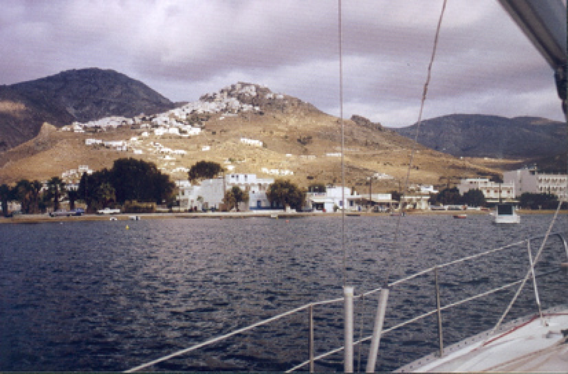 Unser Kurs führt nach Süden Richtung Kithnos, das wir aber wegen toller Winde und guter Fahrt passieren und weiter gen Serifos laufen. Am Nachmittag schläft der Wind nicht ein, sondern frischt noch etwas auf, jetzt deutliche Bft 5 und die hohen kurzen Wellen gepaart mit langer hoher Dünung bringt die Mama Jenny gewaltig ins Schaukeln. Kurz bevor wir in die Sonne schießen wird gerefft und rechtzeitig vor Sonnenuntergang laufen wir um 1700 in die Bucht von Ladiki auf Serifos ein. An der Hafenmole liegen schon drei Yachten - alle längseits - sehr sozial!! Wir legen mit Buganker und Heckleinen an, da die Poller ausgerissen und die Eisenhaken zerbrochen sind, machen wir das ganze Manöver gleich zweimal. Die Längslieger staunen nicht schlecht über die profihafte Leistung unserer Söhne. David macht den Anchor-Man. Belohnt werden die beiden später im Lokal mit Respektbekundungen.