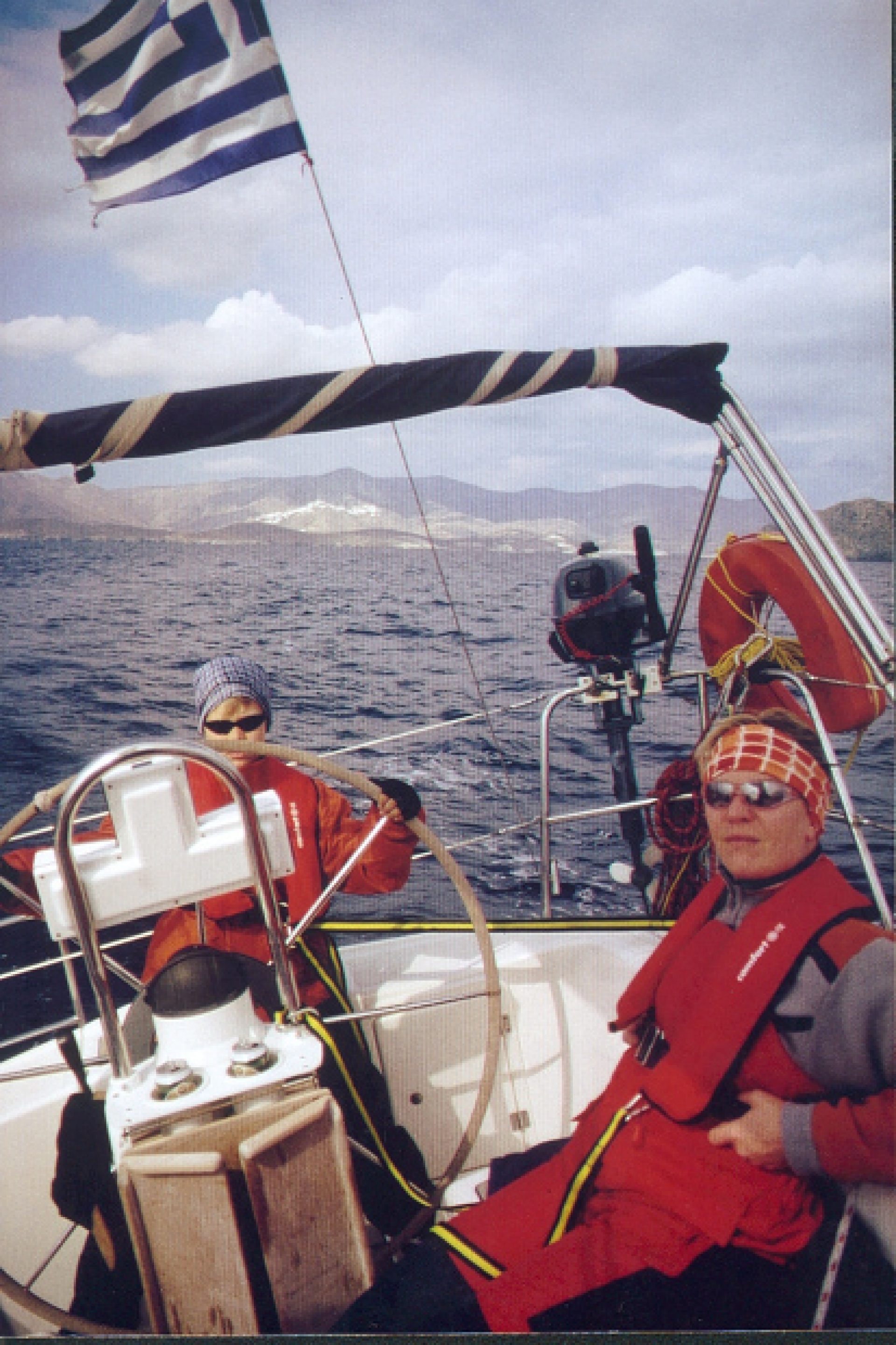 Gegen 1400 erscheint uns der Sturm wie eine Bestie, Äolus hat wohl mehrere Säcke aufgemacht. Matthias hat es dennoch geschafft, zwischen den wiederkehrenden "3-Schwestern" Kurs zu halten, und wir befinden uns in der Bucht von Loutra, so daß wir 2 sm vor der Hafeneinfahrt den Motor anschalten und die Segel bergen. Bis das allerdings passiert ist, haben wir noch einige Berg-und-Talfahrten zu absolvieren. Jonas hilft, so gut er kann, führt aber das Großfall nicht fest genug und das Groß rasselt wieder aus. Beim 2. Anlauf klappt es dann und wir steuern die Hafeneinfahrt an.