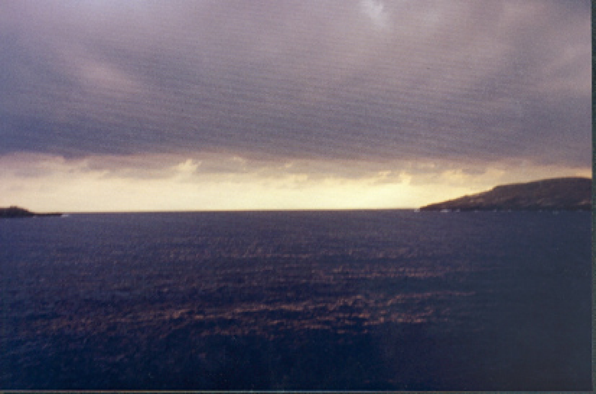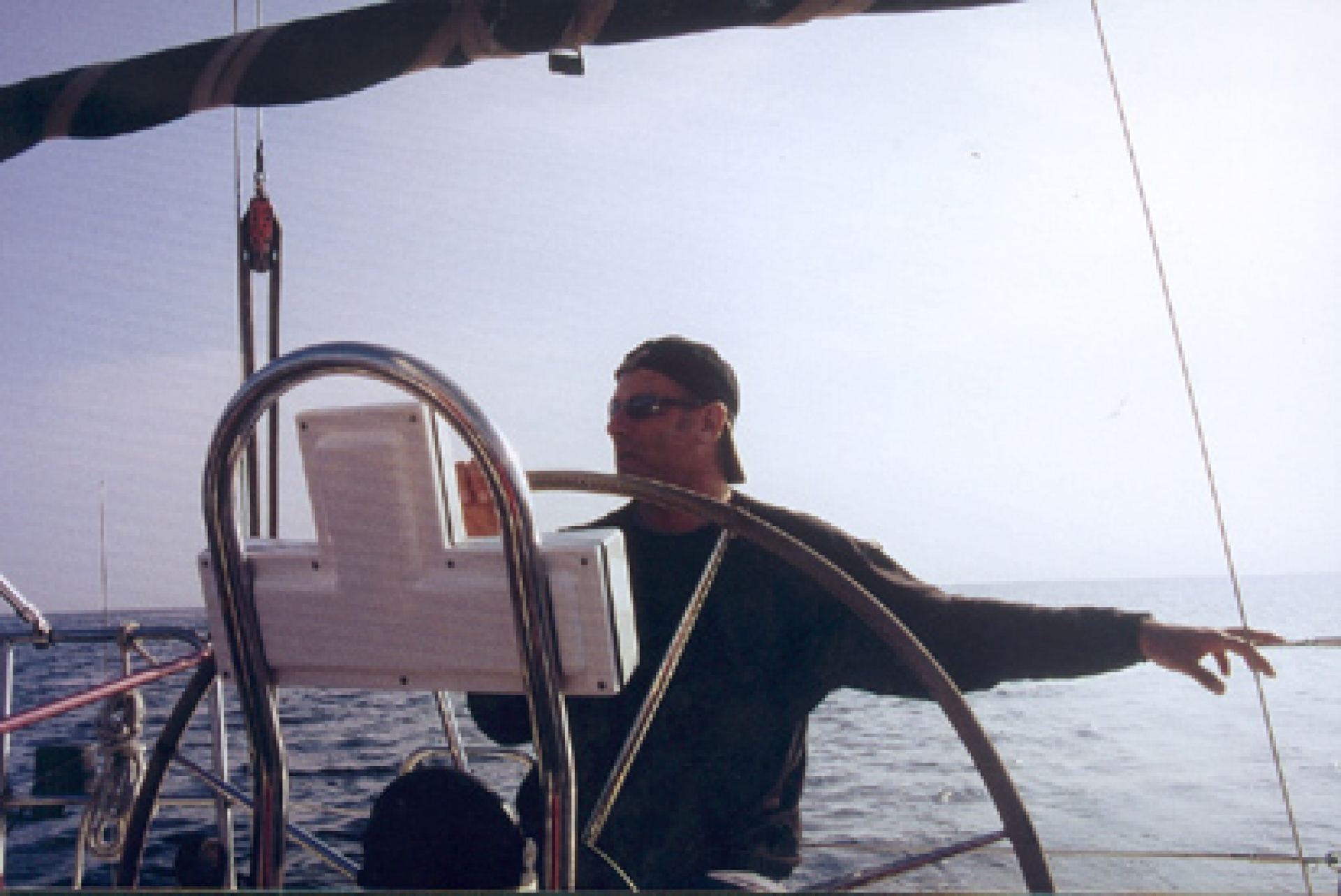 Wir geniessen eine herrliche Fahrt über "moderate sea" und bei schönem Wind, als eine heftige Böe einfällt. Rasch wird gerefft und wir setzen die Fahrt fort, bei nun starkem Wind aus NNE mit Bft 7-8. Gerefft läßt es sich auch gut segeln, doch das Geschäft wird härter mit zunehmendem Seegang. Nach einer Stunde türmen sich Wellenberge um uns herum auf, die 5m Höhe erreichen und deren Kämme sich weit über unseren Köpfen brechen. Alles ist dicht gemacht, die Kinder unter Deck und wir mit der Sicherheitsausrüstung im Cockpit. Matthias surft die Wellen hinunter und so erreichen wir im Laufe des Nachmittags Spitzengeschwindigkeiten von 11,9kn! Bei durchschnittlich 8kn kommen wir trotz der grauenvollen See und des Windes, der in den Wanten heult wie ein Rudel Wölfe, ganz gut voran. Trotzdem muß ich mich schon sehr zusammennehmen, um nicht in Panik zu geraten.