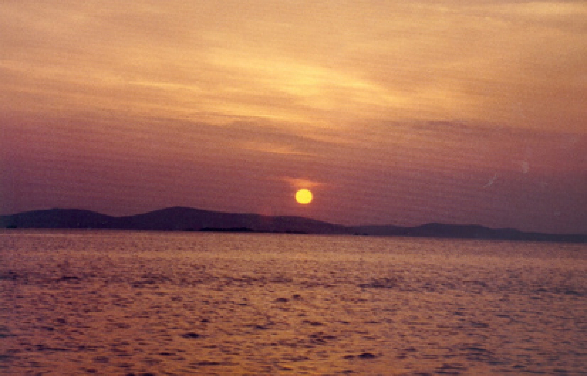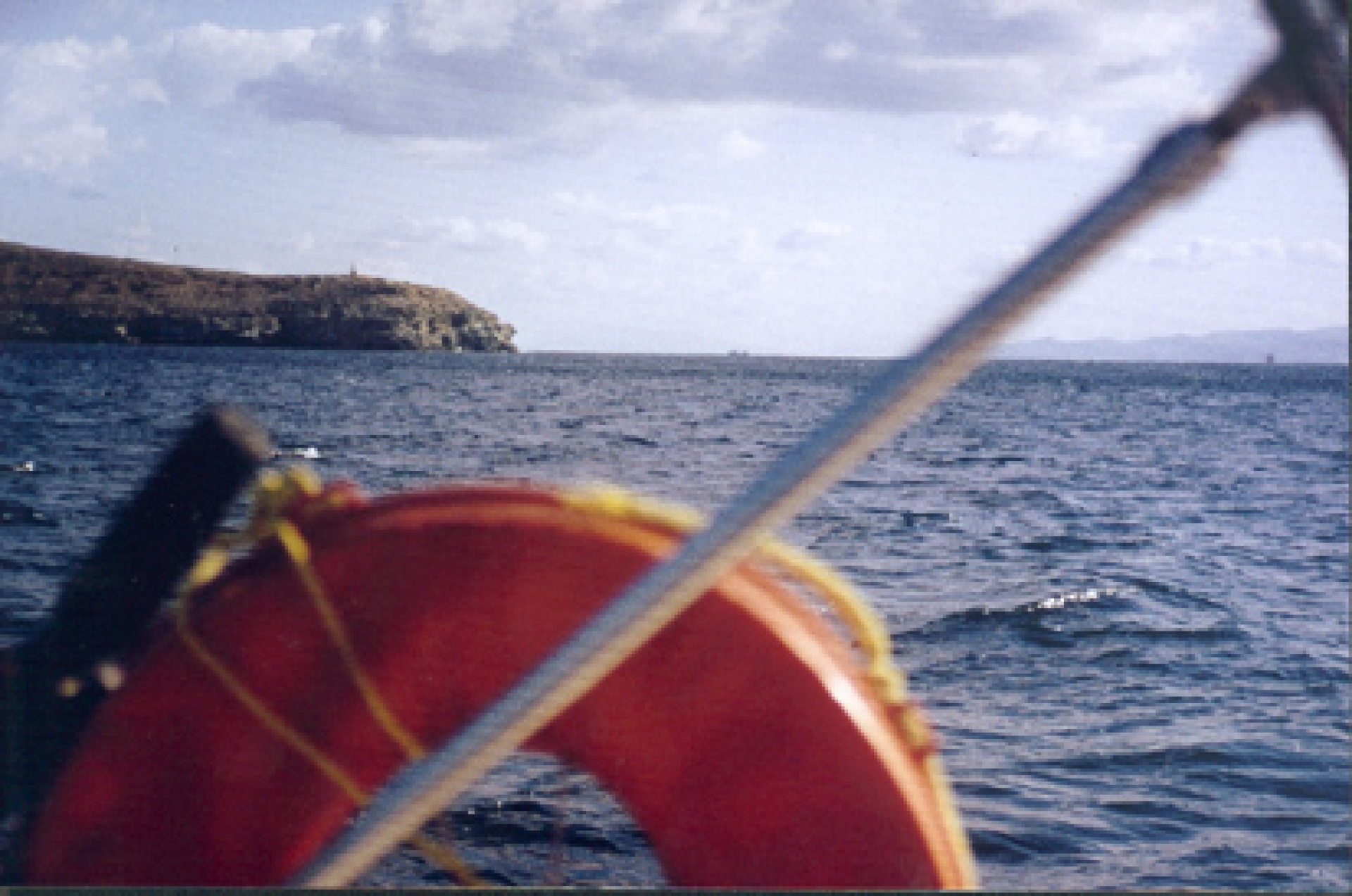 Allerdings ist es stockdunkel und wir drehen uns noch einmal um. Um 0630 weckt mich ein Rumoren an Deck. Matthias ist bereits gestiefelt und gespornt, klariert die Leinen und holt mich an Deck zum Ablegen. Rasch muß ich in die Kleider springen, da es regnet gleich in die volle Montur. Kurz darauf laufen wir schon Richtung Kithnos Kurs 275°.
