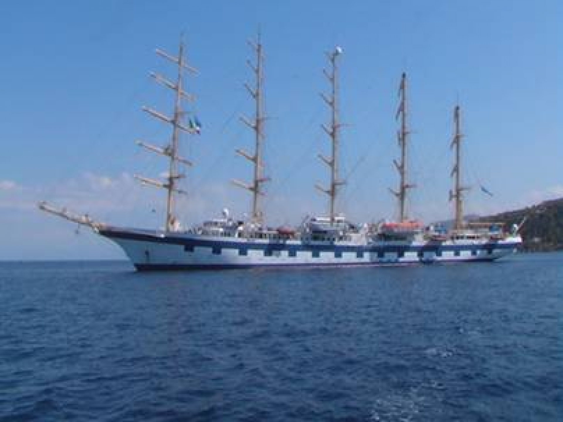 Auf dem Weg zur Marina von Pugnataro besuchen wir noch Lipari-Stadt und umrunden die fünfmastige Royal Clipper aus Luxemburg, deren Gäste ununterbrochen bekocht werden, dafür aber gefahren werden, während wir selber segeln!
