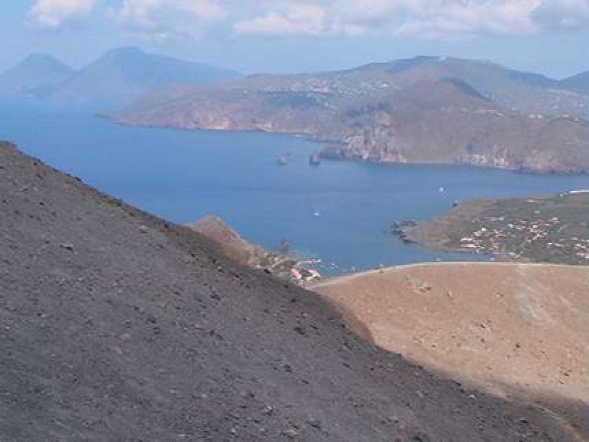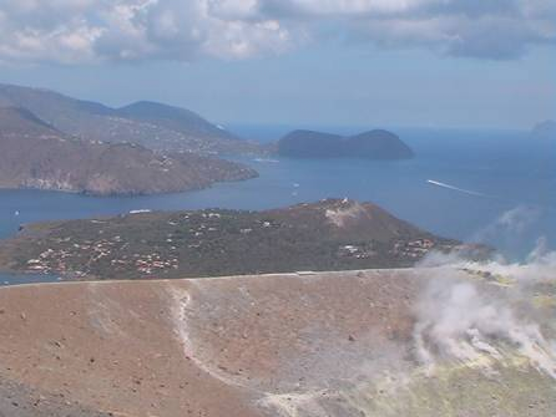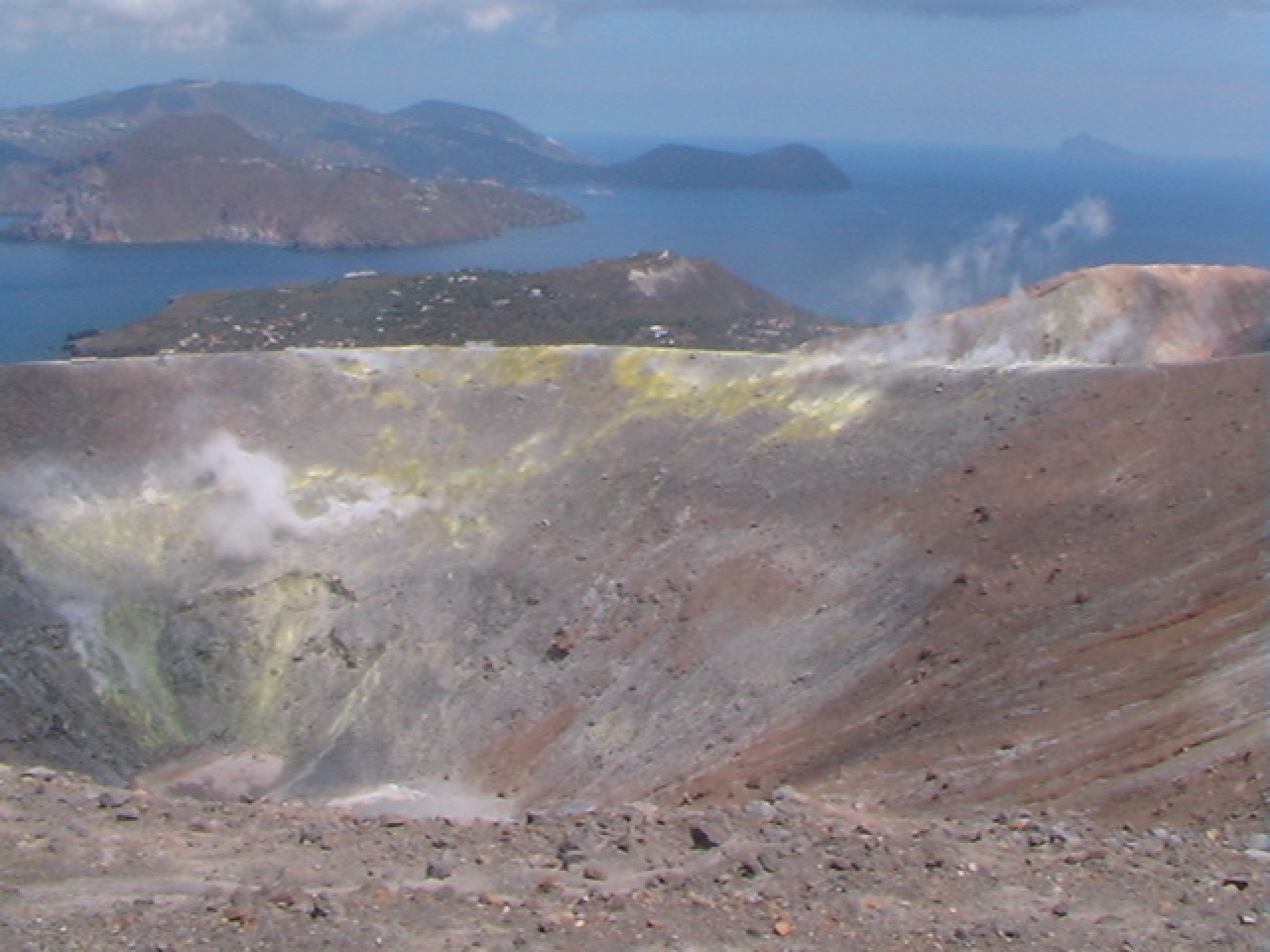 Vom Hafen aus führt der gut gekennzeichnete Weg am Rande Dorfes zum Anstieg, der stetig bergan durch vulkanisches Gestein und spärliche mediterrane Vegetation führt. Auf halber Höhe geht das Gestein über in rötlich später graue Vulkanasche, die oben am Kraterrand immer wieder von kleinen und größeren Fumarolen abgelöst wird, aus denen ein wahrlich diabolischer Atem steigt und allen Bergsteigern, die ohnehin schon etwas außer Puste sind, die Luft rauben. Die Wanderung rund um den Krater bietet spektakuläre und unbedingt sehenswerte Ausblicke über die Liparische Inselwelt. Auch hier oben sollte man allerdings unbedingt den Wind im Auge behalten, denn nur wenn dieser gut steht, ist die Passage einiger Schwefeldampfareale gefahrlos möglich. Ansonsten haben wir den Eindruck, kann tatsächlich ein Erstickungstod drohen. Jetzt jedenfalls ist klar, warum am Rande des Kraters beim Aufstieg ein Hubschrauberlandeplatz eingerichtet worden war.