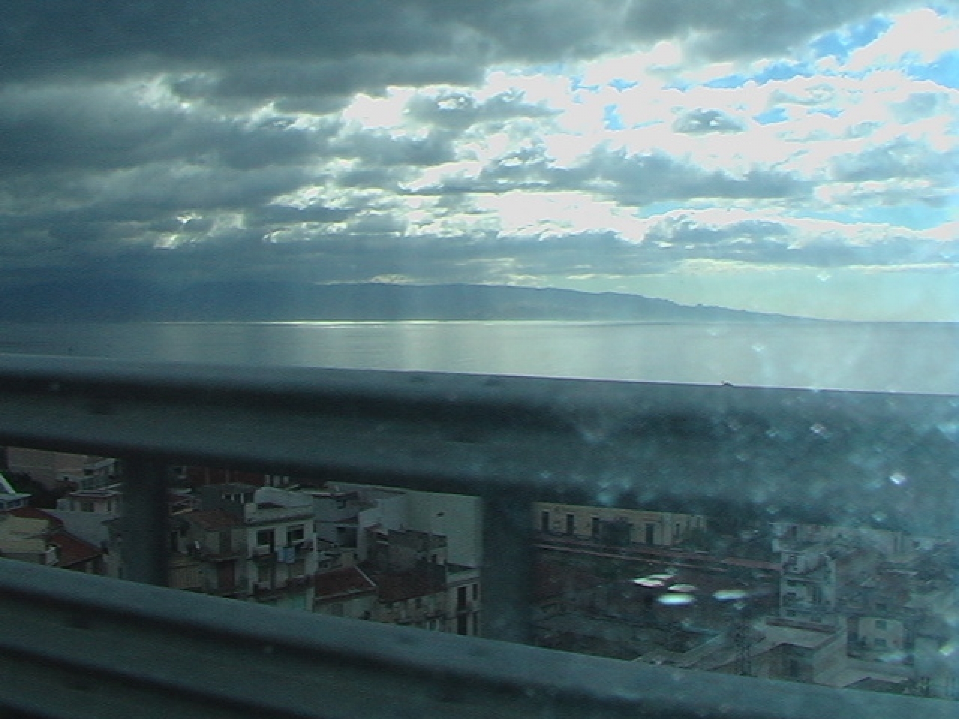 Am Samstag, den 3.6. stehen wir nach einer kurzen Nacht in Erding um 0300 auf, damit wir fertig sind, wenn uns Eusebio um 0330 zum Flughafen bringt. Er ist pünktlich und wir fix und fertig, das Gepäck haben wir schon am Night-Check-In abfertigen lassen und auch unsere Bordkarten erhalten. Dennoch sollen wir 75min vor Abflug am Schalter stehen. Alles klappt plangemäß, auch der Flieger hebt um 0500 in Erding ab. Wir durchqueren die Wolkendecke vor München und sehen bis vor die sizilianische Nordküste kein Land, kein Meer nur dicke grau-schwarze Wolken unter uns. Beim Anflug auf Catania lichtet sich der Himmel, und wir genießen einen grandiosen Blick auf den Ätna und eine aufgewühlte See mit Schaumkronen. Sizilien begrüßt uns morgens um 0700 mit lauen 18°C und herrlichem Sonnenschein. Auch der Taxifahrer von Spartivento erwartet uns und um 0730 verlassen wir mit allen Gepäckstücken den Flughafen Richtung Messina. Zügig geht die Fahrt an der Küstenautobahn vorbei an Riposto und Taormina nach Messina zur Fähre. Das kalabrische Ufer auf der anderen Seite der Stretta erscheint im morgendlichen Sonnenschein, der sich gerade eben in dünnen Streifen durch die sich verziehenden Regenwolken zwängt.