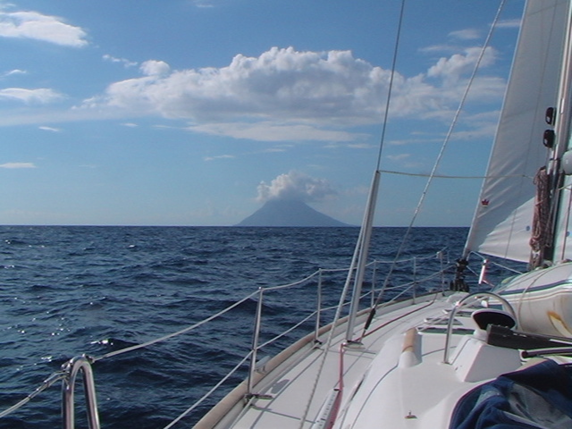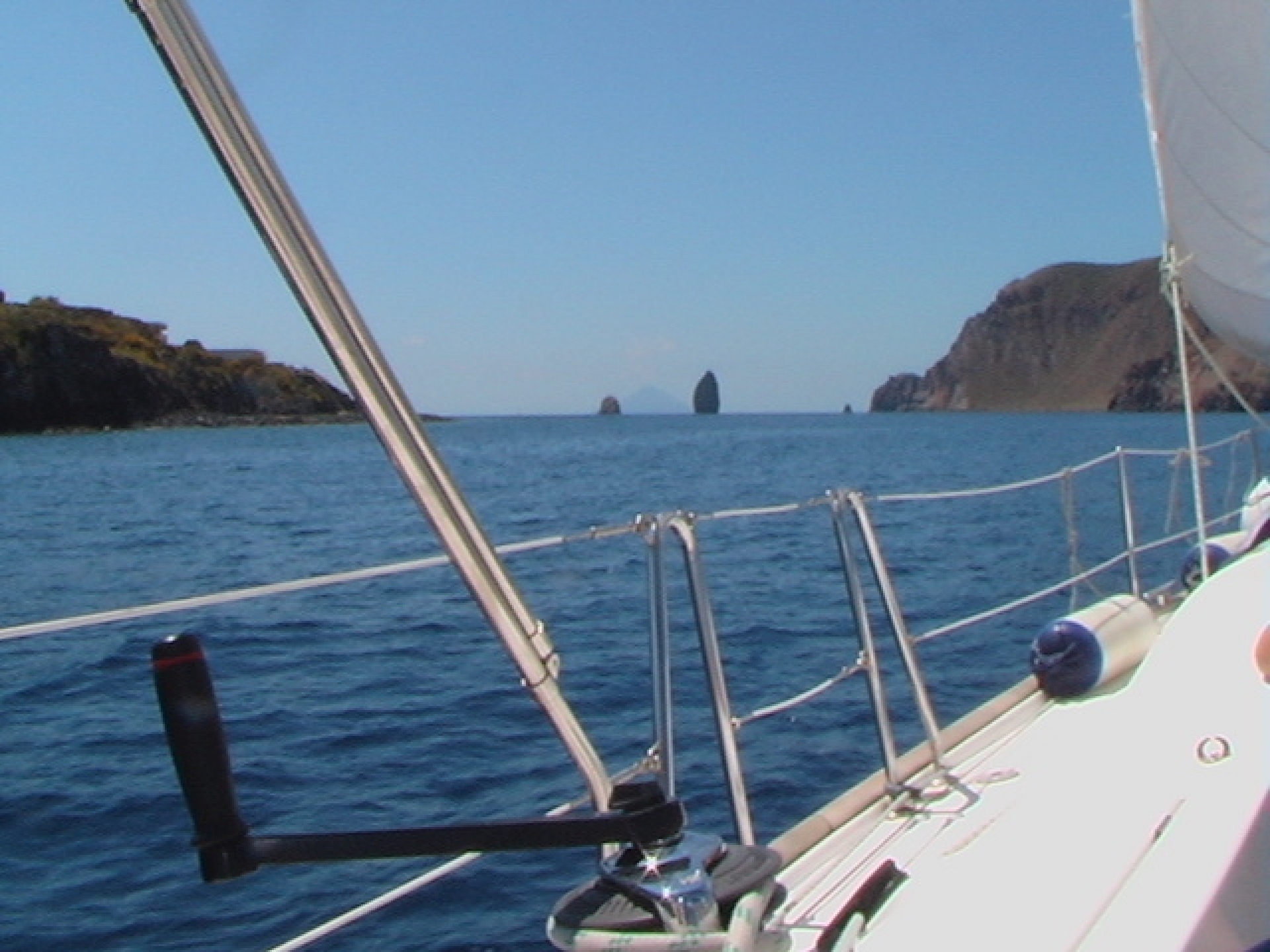 Um 1200 setzen wir unsere Fahrt fort, vorbei an der Feuerrutsche Richtung Salina. Der Wind beschert uns angenehmes Segeln bei halbem Wind mit 5-6kn. Nach zwei Stunden liegt Panarea backbord querab und zieht mich magisch an: zwei markante gegenüberliegende dunkle Felseninseln, mit zum teil bizarren Zacken, dazwischen kreuzende Segelschiffe und an Land weiße Tupfer auf schwarzem Felsen. Unser Weg führt leider nicht dorthin! Die Gegend ist gefährlich und hochexplosiv, heiße Gase und Dämpfe entweichen unterseeisch dem vulkanischen Gestein und Meeresgeologen nehmen täglich Proben, um bei veränderter Zusammensetzung, die eine bevorstehende Eruption anzeigt, rasch Alarm zu schlagen.