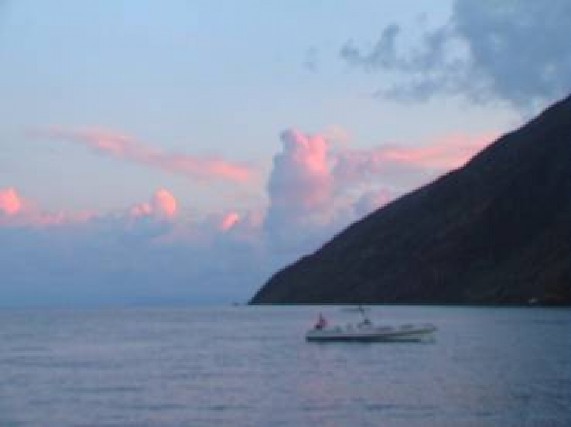 Der Wind stellt sich gegen uns und wir laufen wie von einem Magneten gezogen direkt auf den Stromboli zu, den wir eine Stunde vor Sonnenuntergang erreichen. San Vincenzo liegt leeseitig, so dass wir tatsächlich festmachen können an den Fischerbojen. Die Jungs setzen mich im Dingi über und ich schnappe mir den ersten Fischer - vermutlich ein solcher, um um die Festmacher-Genehmigung zu bitten. Schnell werde ich weiter verwiesen an ein rotes Haus mit weißen Säulen direkt am Anlegesteg der Fährschiffe. Dort ist alles "chiuso" und ich wende mich an das benachbarte Lokal. Zwei Italiener winken ab - "chiuso" -, nein, nein, ich wolle nur über Nacht an der Muring liegen, radebreche ich mit Fingerzeig auf die ONE. Ach soo, alles klar, ob ich zufällig Deutsch spräche. Jaaaa. Was für ein Glück, freut sich der Italiener, worin ich völlig mit ihm übereinstimme. Über UKW-Handsprechfunk nimmt er Kontakt zu dem "Marina"-Betreiber auf, der uns an die gelben Muringbojen verweist, die seien frisch verlegt, es gäbe 4 für Yachties. Mit dieser guten Kunde kehren wir zurück an Deck und belegen um. Um 1945 liegen wir fest vor Muring am Stromboli nach einer 62sm Tagesetappe, die sich sehen lassen kann. Der Anlegeschluck ist verdient und schmeckt, während der Stromboli uns mit Rauchwolken, durch die die untergehende Sonne ihre Strahlen schickt, und Donnergrollen begrüßt. Als wir den Blick gen Osten richten, staunen wir über einen blass rosa bis lilafarbenen Himmel und kleinen aneinander gereihten Ambosswölkchen, was wir so nur in der Karibik gesehen hatten.