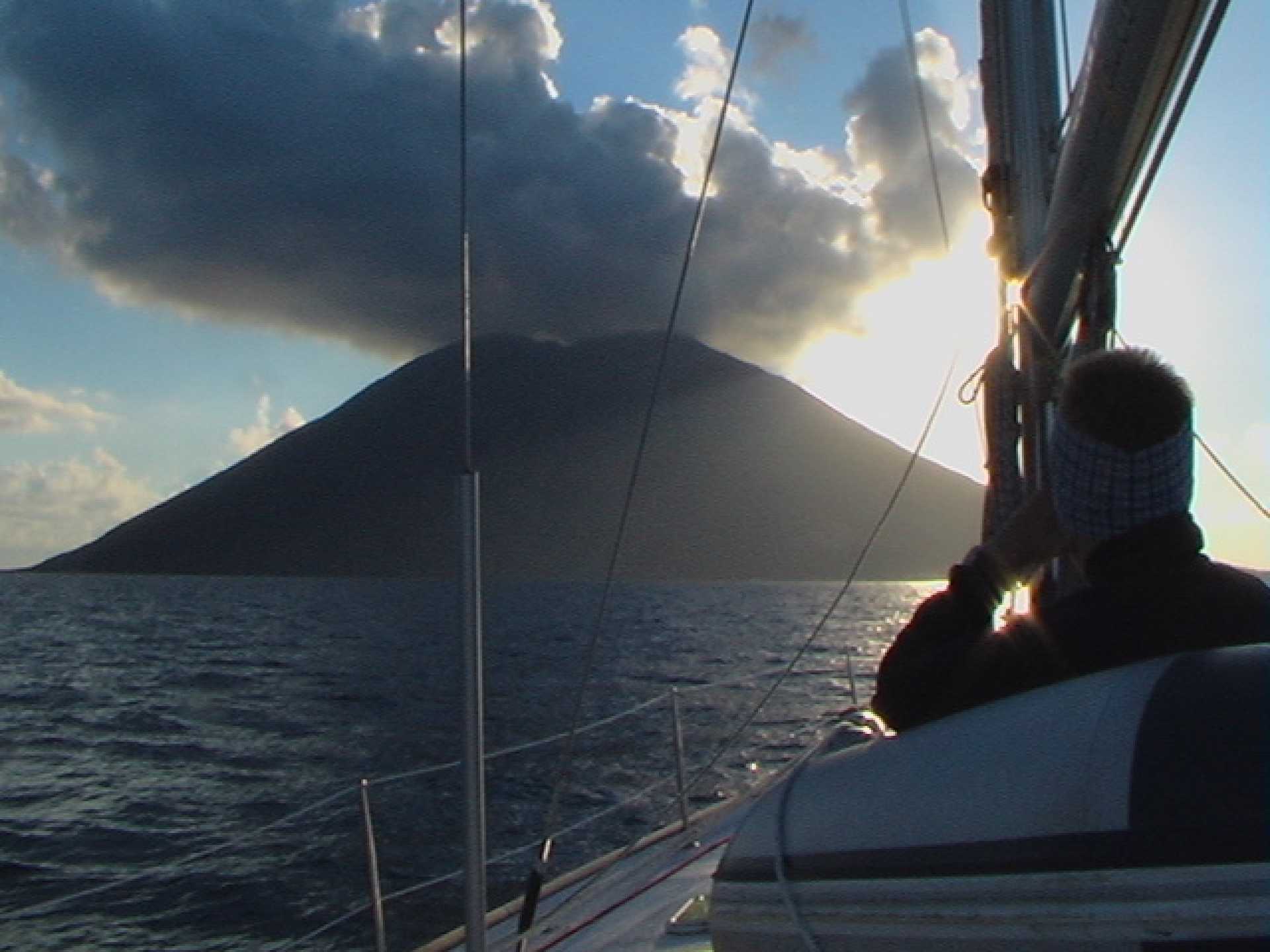 Nach dem Captain's Dinner, das auch von diesem zubereitet worden war, werfen wir gegen 2200 noch einmal den Motor an und nehmen Kurs auf die Feuerrutsche, um das nächtliche Feuerwerk des Strombolis zu beobachten und sein Grollen dazu zu vernehmen. Den Strombolicchio lassen wir steuerbord liegen und navigieren vorsichtig am Nordost Kap der Insel vorbei, da hier immer wieder Fischernetze ausgelegt sind. Alles klappt hervorragend, zu nah sollte man sich allerdings nicht ans Ufer wagen, denn, so sehen wir am darauf folgenden Tag, dort gibt es eine Untiefe, die mit einem nicht beleuchteten Gefahrenzeichen markiert ist.