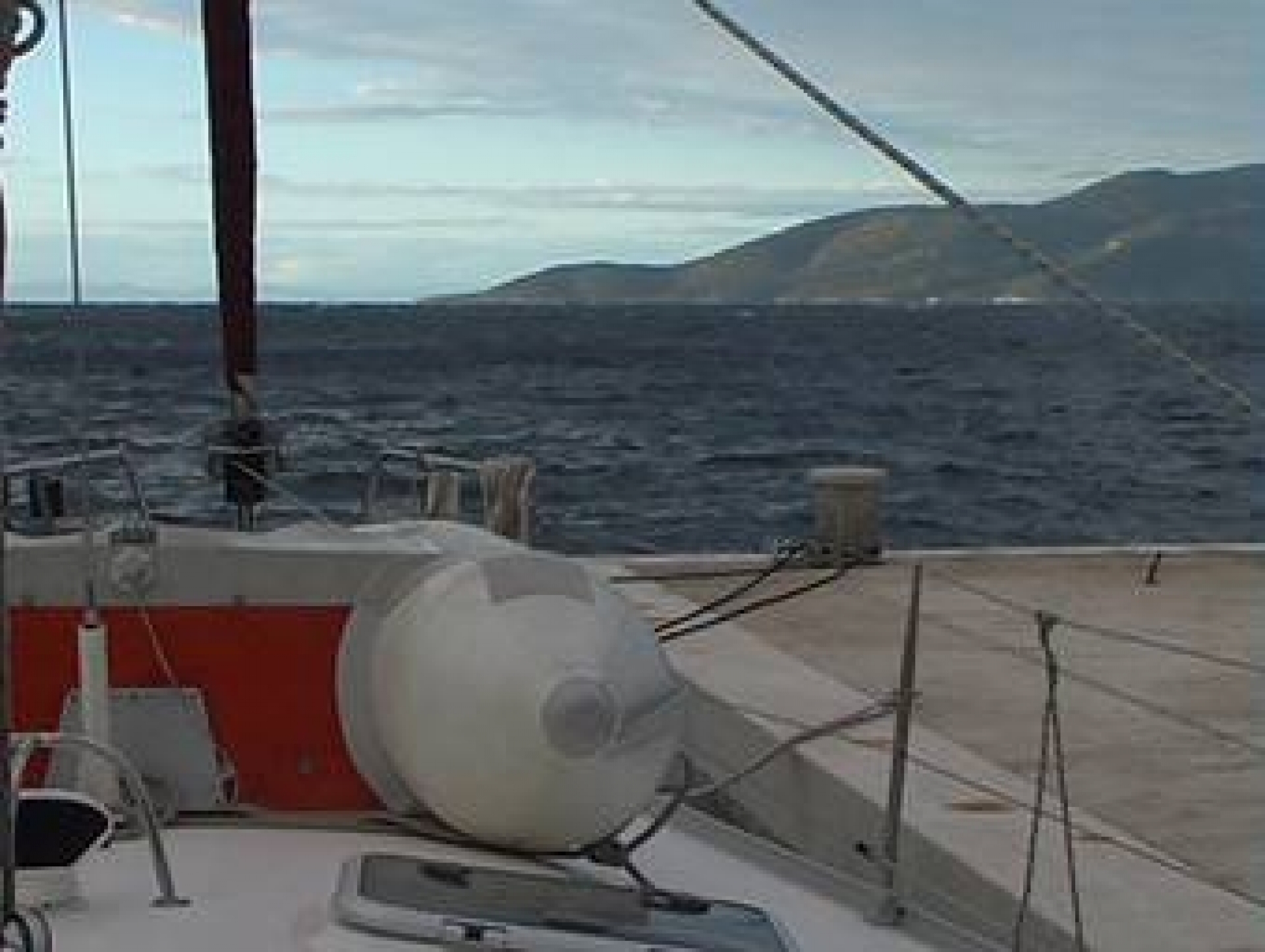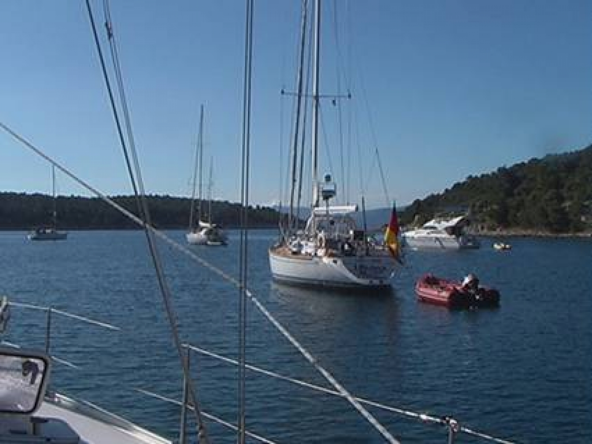 Immer wieder prasseln Regenschauer aufs Deck, während der wir das Groß, das sich im Sturmwind aus den Lazy-Jacks gelöst hat, mit zusätzlichen Benseln verzurren und weitere Landfesten ausbringen. Als der Wind gegen 1800 etwas nachlässt, koche ich Penne mit Tomaten-Speck-Pilz-Soße. Während dessen verschwinden die Kroaten plötzlich, was uns veranlasst, unsere Entscheidung in Bisevo zu bleiben, noch einmal zu überdenken. Laut Hafenkarte und Küstenhandbuch ist Komilje ebenfalls nicht ganz sicher und sehr wahrscheinlich randvoll mit Schiffen, die sich dorthin geflüchtet haben.
