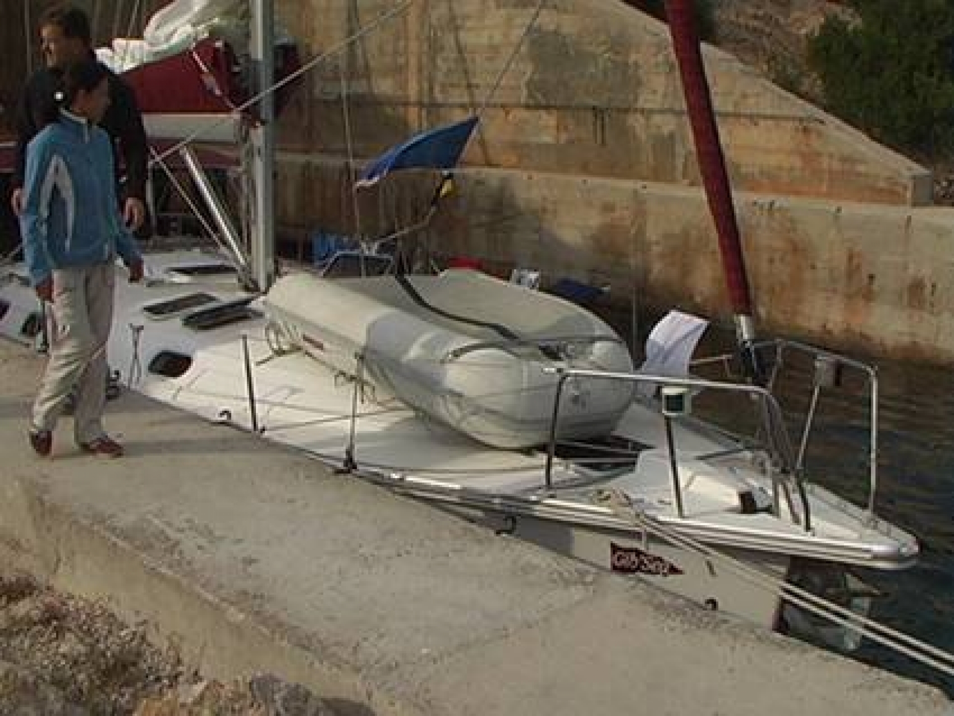 Nach einigen Minuten kreisen auf engem Raum werden wir aber zu glücklichen Eroberern einer Muringboje. Das Dingi wird klar gemacht, wir ziehen Regensachen über und wollen vom Skipper übergesetzt werden. Der wundert sich über einen wiederholt absterbenden Motor und treibt etwas hilflos durch den Hafen, denn Paddel hat er auch keine mitgenommen typischer Anfängerfehler ;-)!
